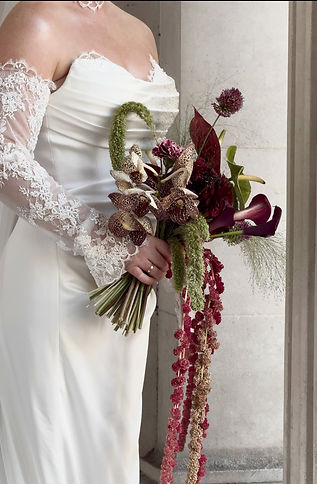 "Zoe was so lovely to work with, I told her we'd like a deep red theme. I allowed Zoe to have full creative control of the flowers and I'm so glad I didn't get involved because my bouquet was STUNNING. All the flowers were stunning. We got married at Old Marylebone Town Hall and the staff were literally gasping and in awe of my bouquet!"